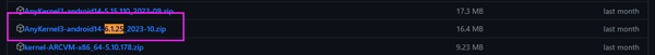 1.首先在github上和设备内核版本一致的AK3包。比如 小米 14Pro 的内核版本是 6.1.25-android14 ,这里一样名字前面带AnyKernel3的版本。