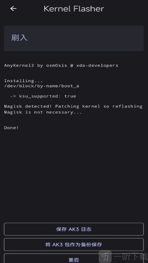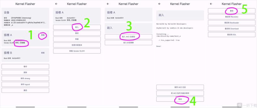 查看插槽(已挂载的)→ 刷入 → 刷入 AK3 压缩包 → 刷入成功(重启)→ 重启设备,然后即可成功刷入。