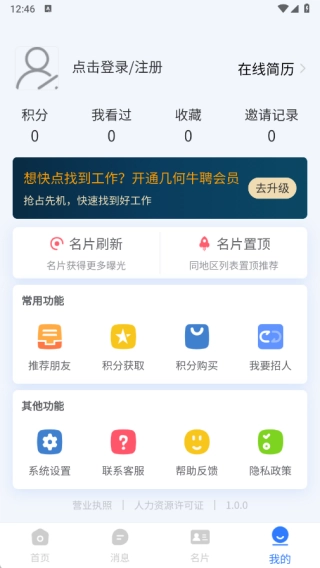 3、在名片页面,您能够查看自己的报名情况,填写求职状态、自我介绍以及求职意向等相关信息。