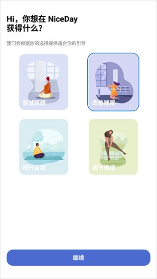 1、首先打开niceday软件,接着选择自己想要达成的目标,像改善睡眠质量、调节情绪状态这类都可以;