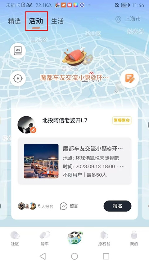 2、在地图界面点击用户头像,即可查看具体活动详情,挑选感兴趣的活动进行报名就可以了。