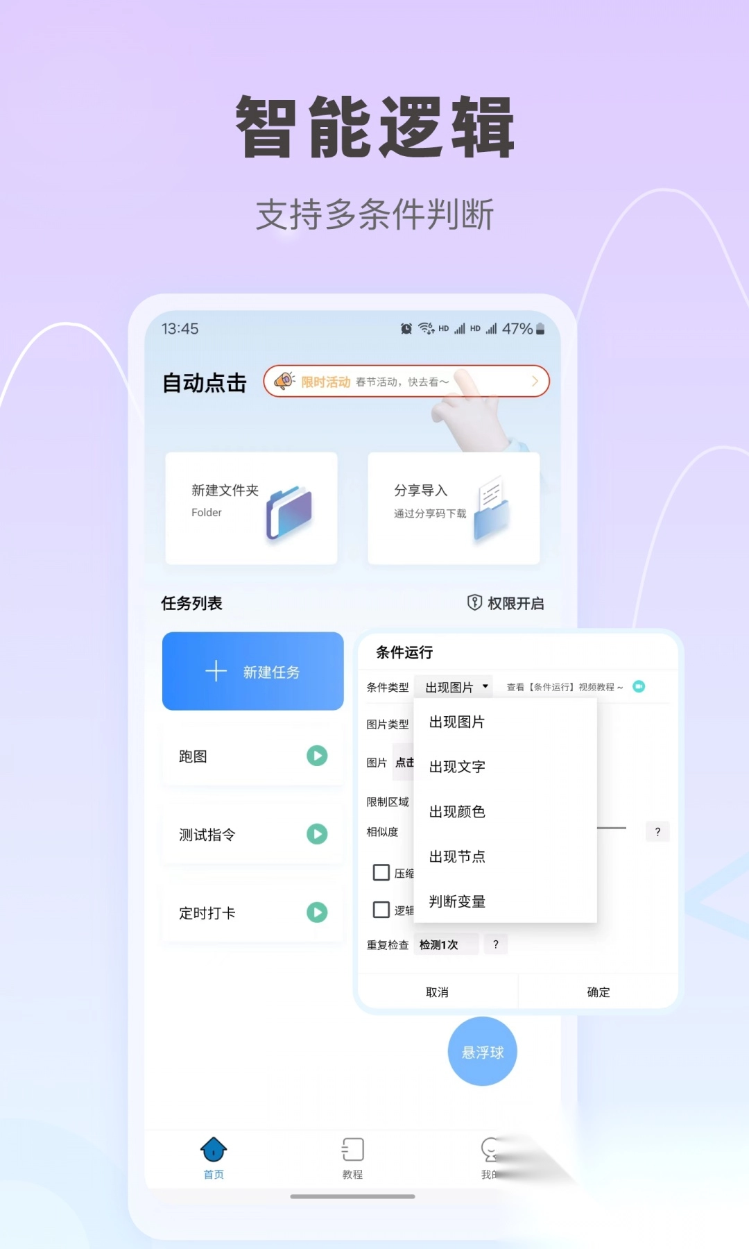 按键精灵安卓版免root是一款十分实用的辅助工具,具备强大的编辑功能,能帮助用户实现屏幕自动点击,还可进行频率、定时等设置,让用户的工作更高效,同时支持精准的图像识别功能,清晰呈现具体内容,有需要的用户不妨来体验一下。