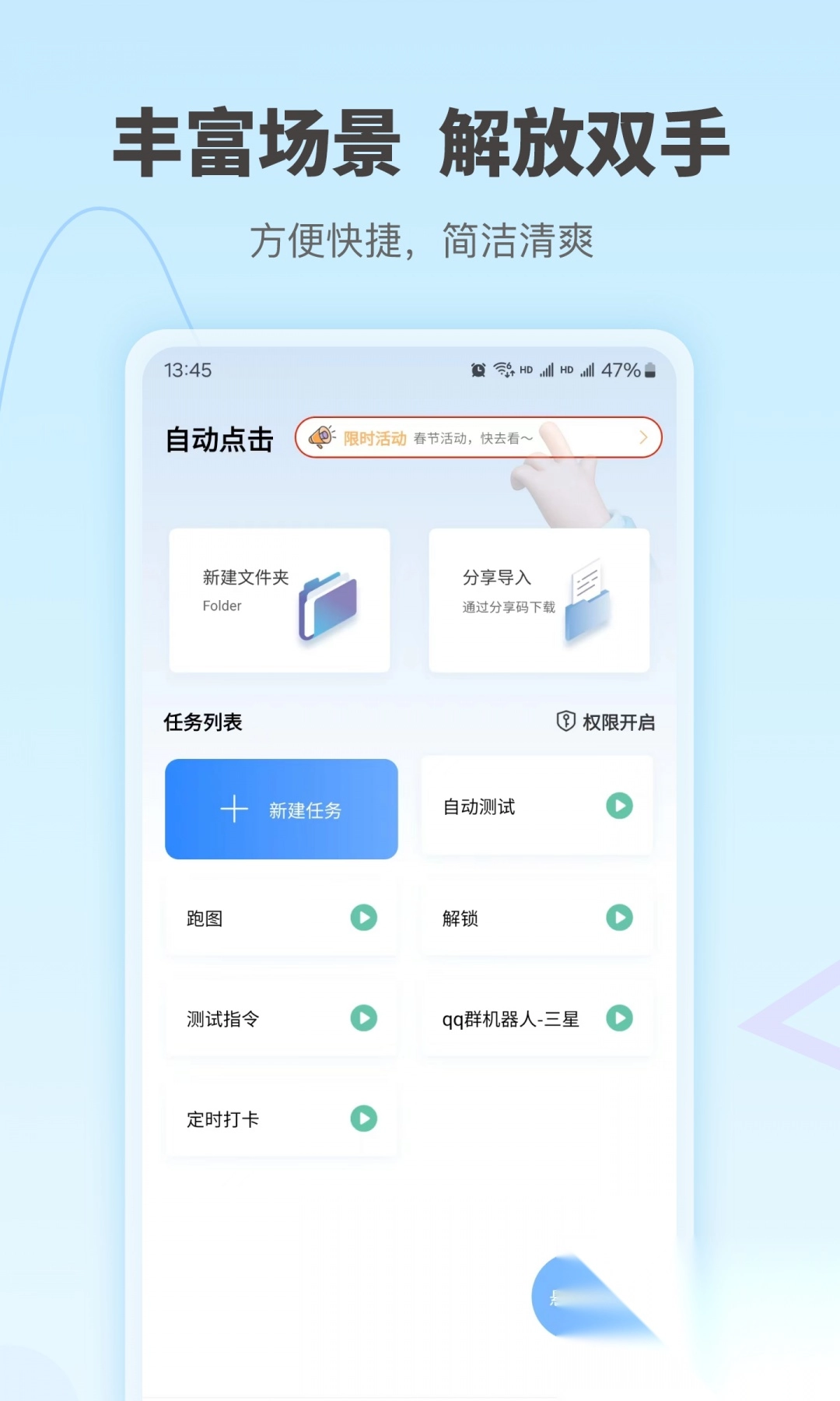 强大的自动点击功能,可支持多点折线滑动手机屏幕,让操作更具灵活性。