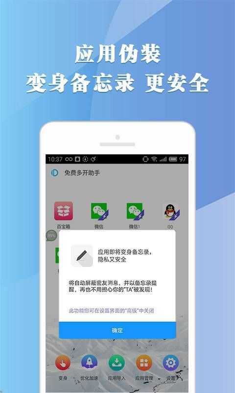 应用变身成备忘录,隐藏应用入口,设置应用锁,隐藏应用多窗口,只有你看的懂的来电提醒,通知消息。