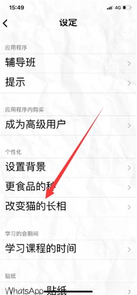 在设置页面下方,找到并点击“改变猫的长相”选项。