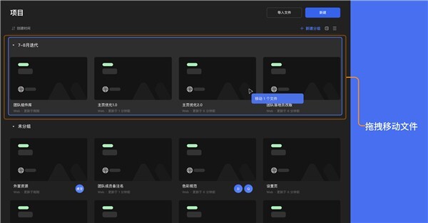 选择按照“文件分组”模式显示,文件会在项目内按照文件被设置好的分组进行显示,未设置分组的文件,会进入一个名为“未分组”的分组,分组默认按照“新建分组”的时间排序,“未分组”会默认在所有分组最下方,所有分组的排序可通过拖拽进行调整,可根据自己的需要调整分组排序,分组排序仅对自己有效,且不会影响到团队内其它成员的查看。
