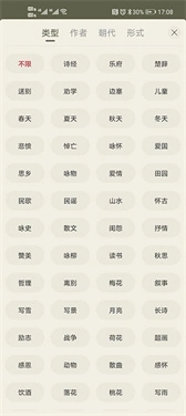 2、用户也能自行手动查找古诗文阅读,软件已按类型、作者、朝代、形式划分为四大类,每个大类下还设有若干小类。