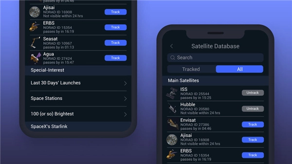 Satellite Tracker是一款专注于搜寻天空卫星的卫星追踪工具,它能有效协助用户进行位置追踪,精准定位天空中的卫星,国际空间站从头顶飞过的时间会有详细记录,还可查看所在位置上空是否有卫星,实现24小时持续追踪。该软件操作简便,用户能随时查看卫星飞行画面,随地获取人造卫星的位置信息。