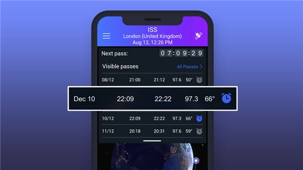 千万别错过配备卫星跟踪器的国际空间站。点击右上角的卫星图标,就能知晓国际空间站下次经过您所在位置的时间。设置警报还能收到过境相关通知哦!