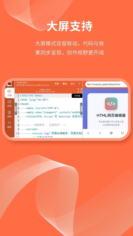 2、大屏幕模式可实现双窗口交互,代码和效果同时呈现,提供更广阔的创意视野。