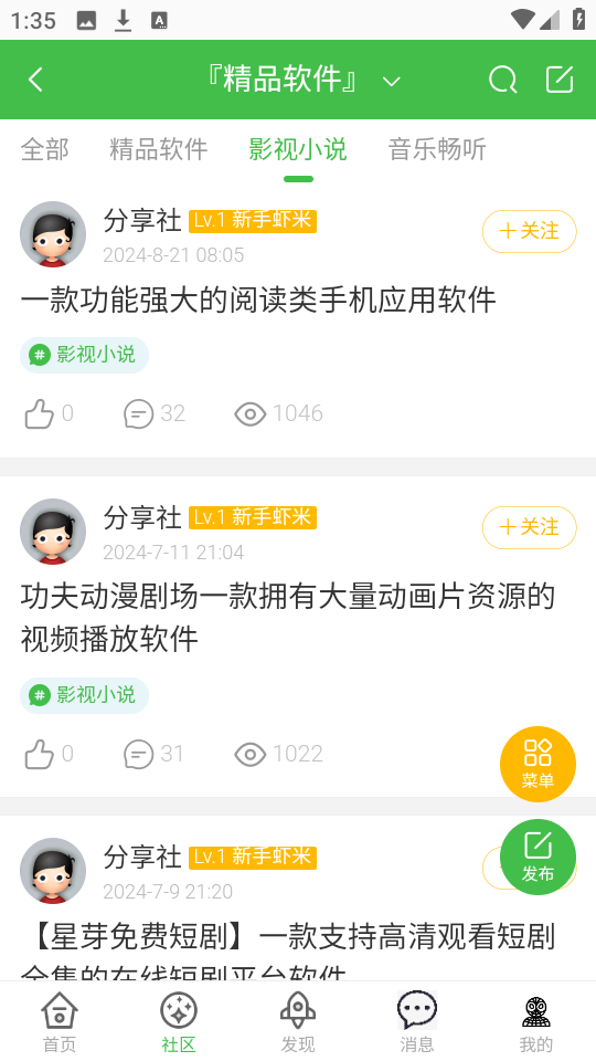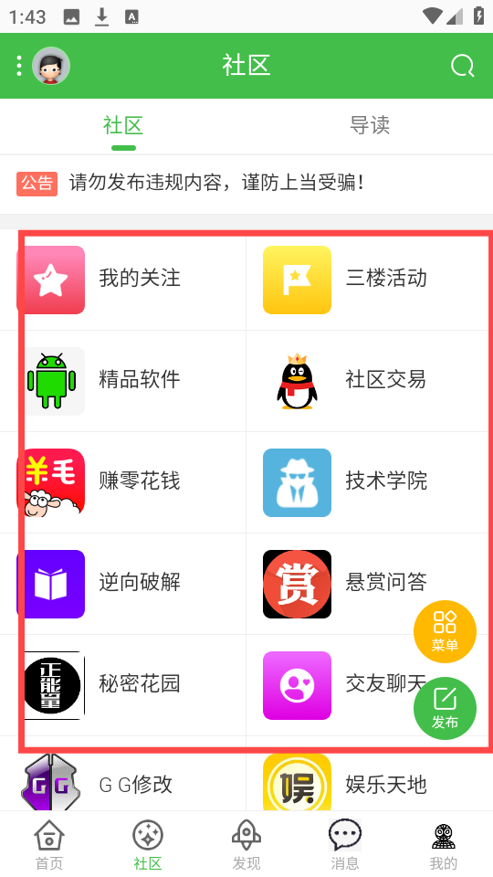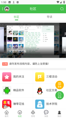 3、随后点击下方的“社区”,就能看到精品软件、社区交易、技术学院等板块。