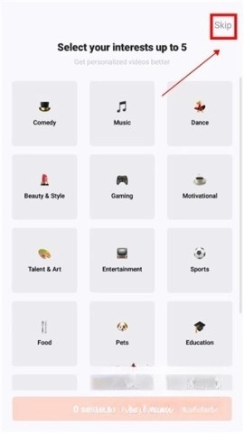 1. 首先打开Kwai快手海外版,进入应用后会出现喜好设置环节,该环节可根据个人意愿选择内容,也能直接跳过。