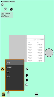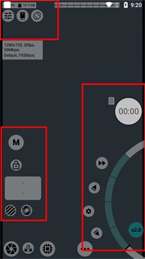 2、我们来看一号红框,按照从上到下、从左到右的顺序,各项功能依次为电池剩余电量、手机剩余存储空间、全局预设、当前使用镜头、屏幕方向和手电筒。