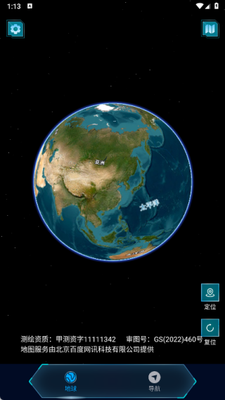 3、进入地球页面后,可通过定位功能查看各类地点,还能一键复位。