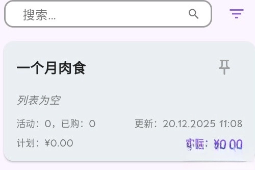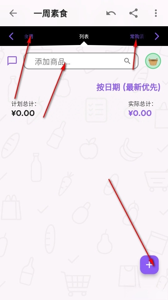 创建完成后,我们会进入清单列表页面。在这里,上方可以查看自己创建的食谱和常购清单,也能搜索列表中的物品;右下角则可以创建或编辑具体的清单采购计划。