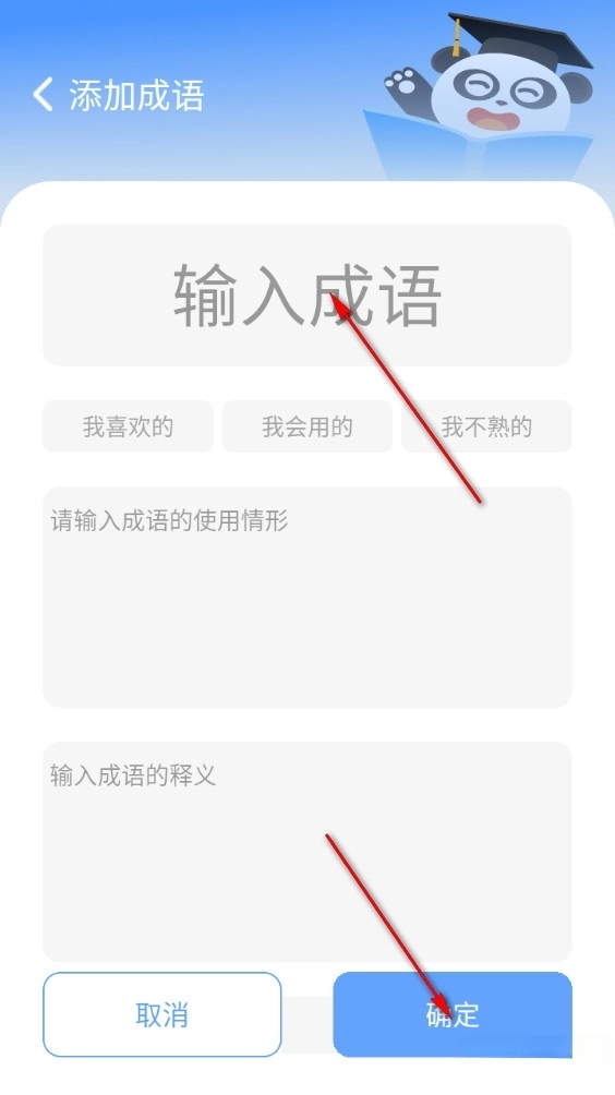 支持用户自定义添加成语并保存,还能依据熟悉度进行分类记录,便于用户在日常中查找和学习。
