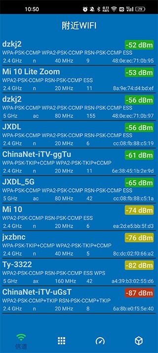 1、在本站安装并打开软件,来到软件首页,在这里可以查看附近wifi的信号强度;