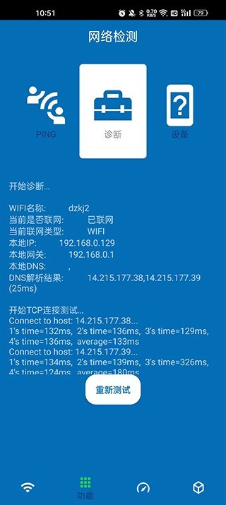 2、点击功能,点击测试可以测试你所连接的网络的ping以及网络信息;