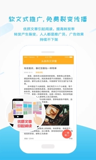 易推广app最新版是一款手机端的营销推广软件。这里有众多高质量热门文章可以让用户一键插入自己的广告,或者通过微博、QQ、微信朋友圈等社交平台转发传播,形成免费等裂变式推广,让你的推广快捷、高效。