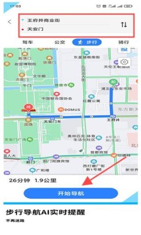 2、输入从【王府井商业街】到【天安门】的路线,点击【开始导航】便可开始您的出行冒险。