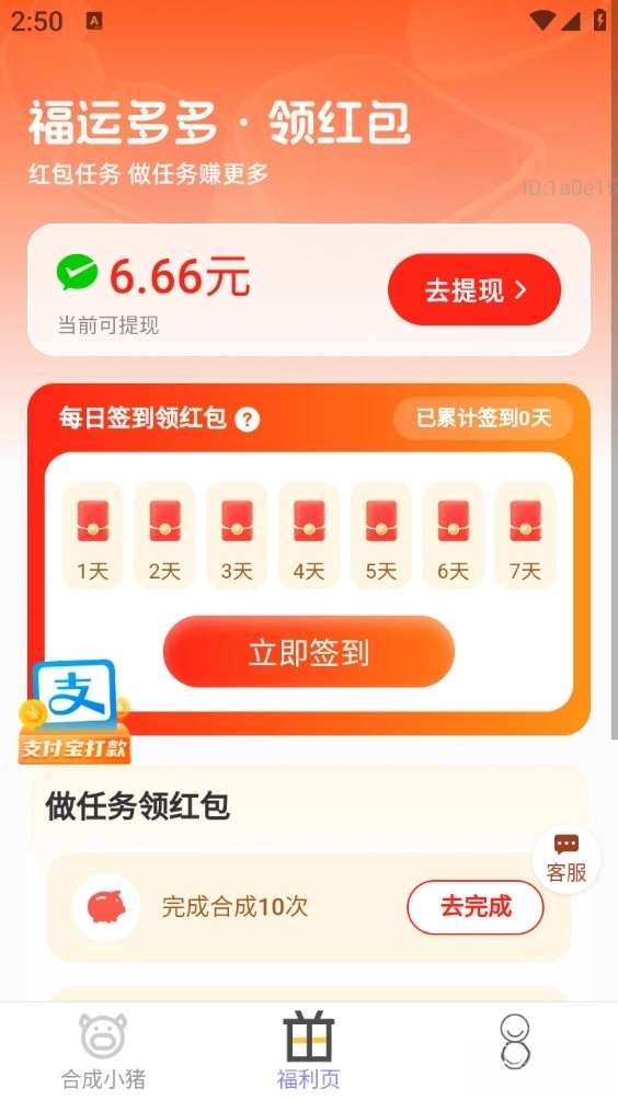 福星赚钱宝这款赚零花的应用挺有意思,做任务能领红包,养小猪合成还能拿奖励;操作特别简单,闲时随手点几下就成,提现也方便快捷,想赚点外快或者打发时间的朋友,可以试试这个,虽说赚得不多,但玩着玩着就能有收入进账。