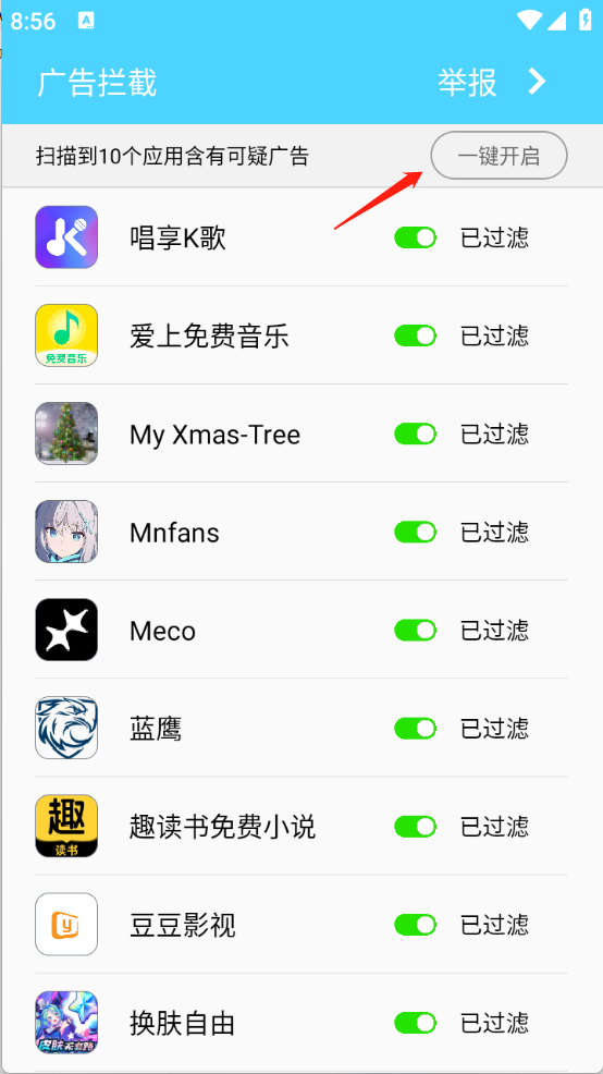 3、开启过滤广告功能即可,也可以选择一键开启。