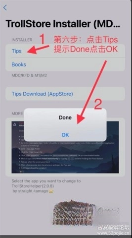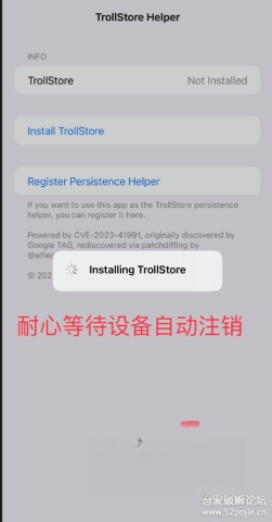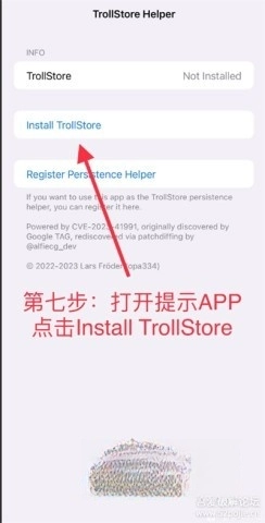 第七步:开启提示,点击“Install TrollStore”,耐心等待设备完成注销操作(其余设置维持原样)。