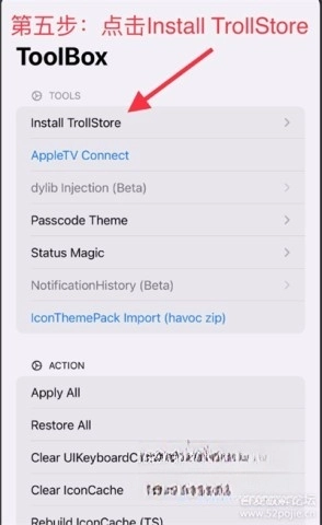 第五步:点击“Install Troll Store”选项(其余选项无需进行任何操作)。