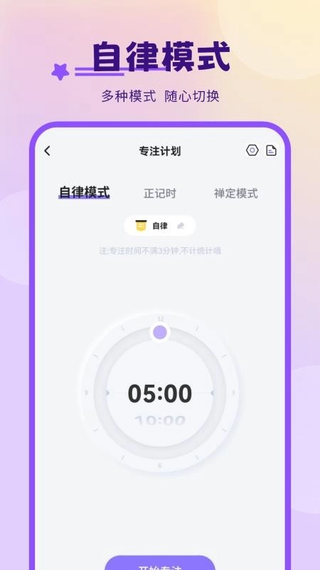 3、例如:选择“自律模式”,然后设置专注倒计时;