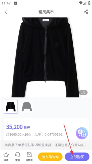 3、在商品详情页,点击“立即购买”按钮,即可进入商品规格选择页面。