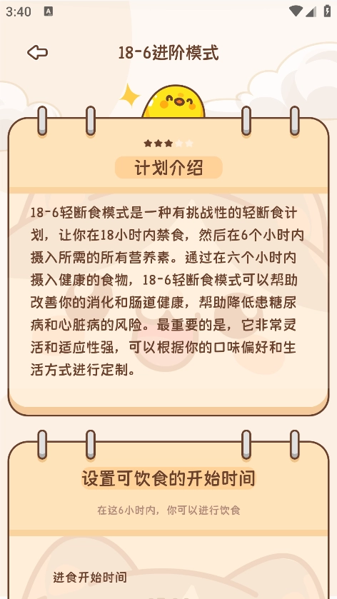 用户能依据自身的作息安排与实际需求,自主调整禁食和进食的时间区间。像可以设置成14:10的模式(即禁食14小时、进食10小时),或者18:6的模式(即禁食18小时、进食6小时),以此灵活满足不同生活场景的需要。