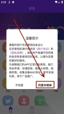安装并打开纹身设计应用,点击【同意并继续】按钮以同意隐私政策。