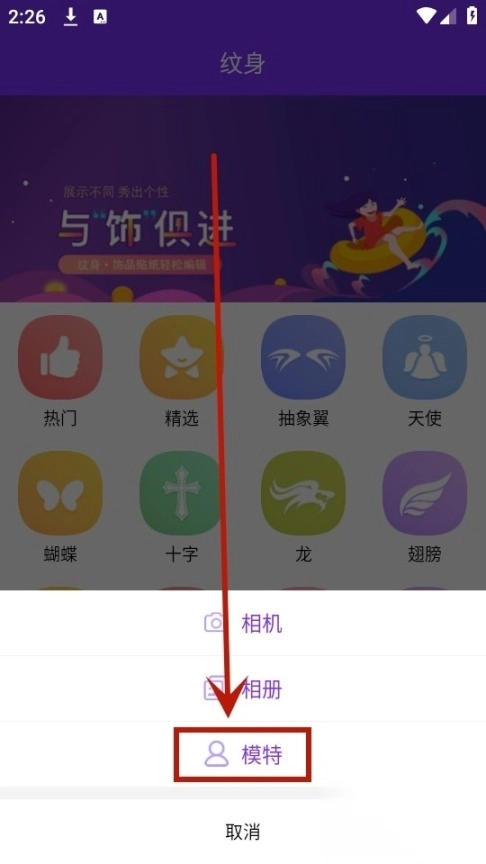 你可以拍摄自己想纹身的部位来体验,要是不想自己拍,点击【模特】就行。