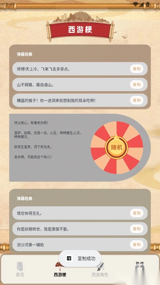 还有随机转盘工具可用于随机抽取西游梗查看,方便用户获取随机西游梗来使用。
