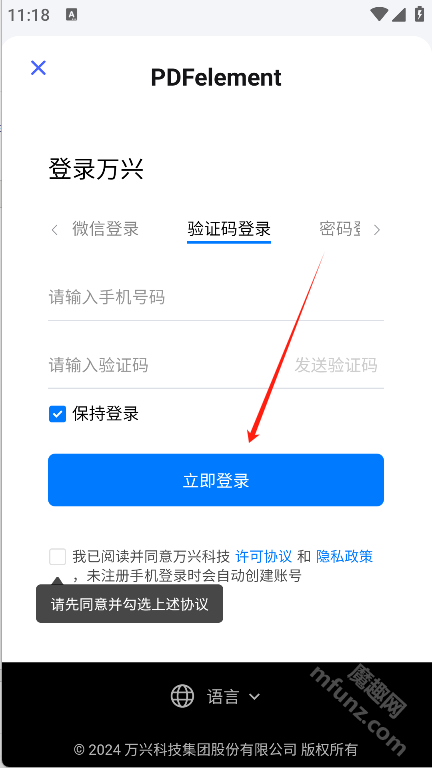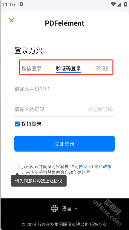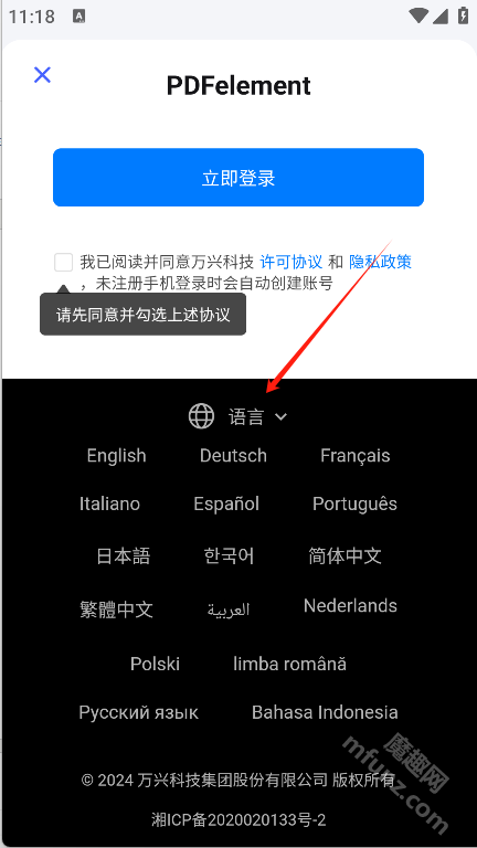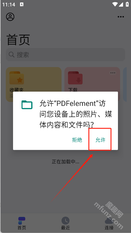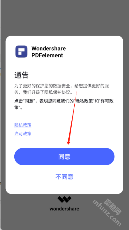 1、首先访问魔趣网(m.mfunz.com)并下载安装pdfelement安卓版,打开软件后点击“同意”进入应用界面。