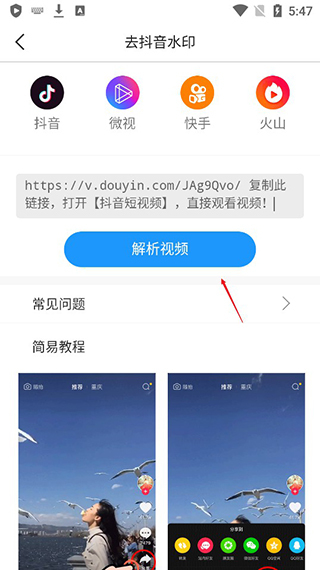 2、随意点击其中一项功能,我在这里以去除抖音水印为例进行演示:你只需把抖音视频的链接复制到对应的输入框里,然后点击“解析视频”按钮,就能完成操作了。