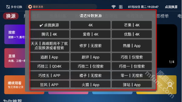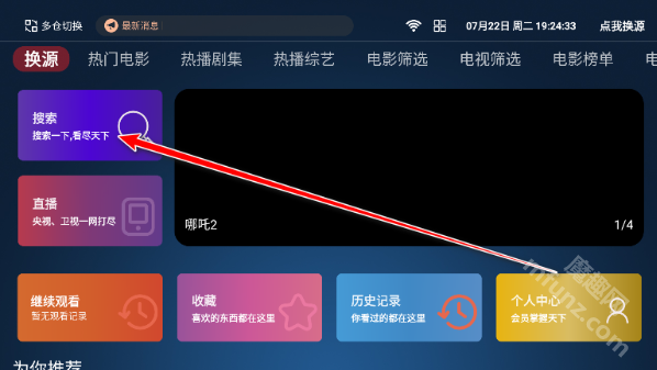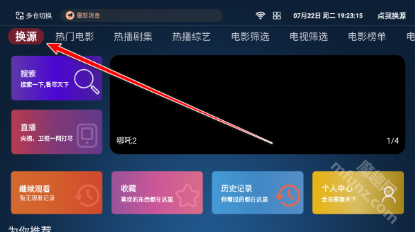 1.启动4k影视TVApp,进入主界面后点击页面左上角的换源按钮。