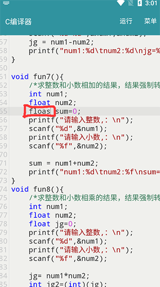 就像这段代码,本应填float,结果写成了floas,代码的颜色就跟着变了。
