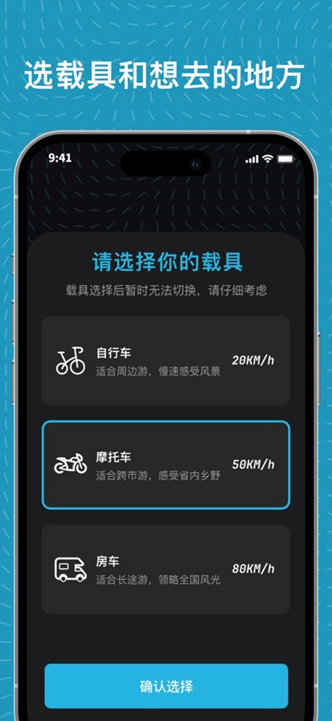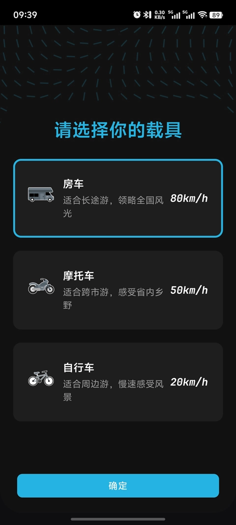 2、选择载具(如自行车、摩托车、房车等),选定后App会依据载具的移动速度,来判断你的当前位置。