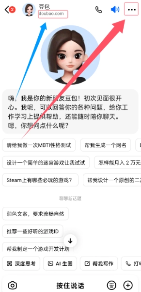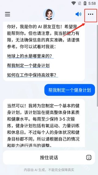 1、打开豆包,点击界面右上角的“…”图标,进入“声音”设置选项。