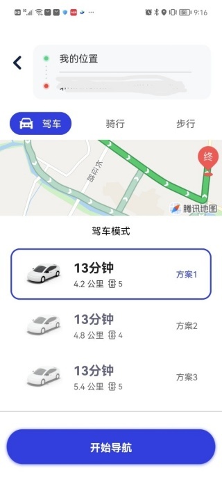 这里提供驾车、骑行和步行三种出行模式,其中驾车模式包含三条不同路线方案,您可选择合适的方案后点击开始导航。