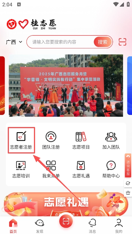 1、打开软件在首页点击志愿者注册