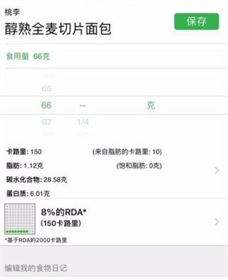 3、早餐的记录还能更细致些,比如你吃了切片面包、苹果、黄瓜和鸡蛋,它会具体标注出黄瓜的长度、鸡蛋的个头大小,接着再将每样食物的脂肪含量、卡路里等数据进行对比,让你能更直观地了解自己每日的营养摄入量。