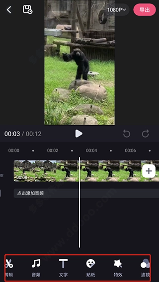 4、在下方可对视频进行设置剪辑、音频、文字、贴纸、特效、滤镜、画布等;
