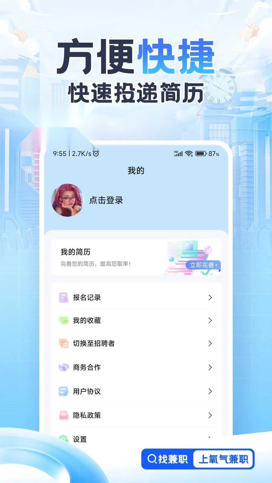 2. 平台多重审核,职位信息安全可靠,采用多重安全防御措施,保证求职者简历信息安全,为大学生、毕业生、白领等群体提供更安全且靠谱的兼职服务。