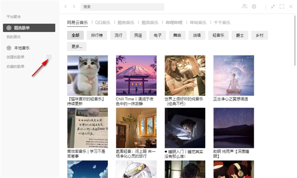 1、首先,我们需要打开listen1软件,接着在软件界面里找到已创建的歌单相关选项,再点击该选项右侧的“+”图标