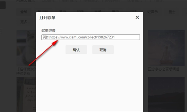 2、第二步,点击“+”图标之后,页面中会出现一个打开歌单弹框,我们需要输入歌单链接,所以我们可以先在浏览器中打开自己喜欢的歌单,然后复制歌单链接