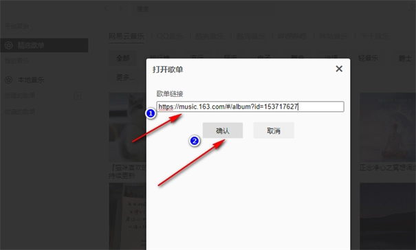 4、第四步,回到listen1软件页面,然后在框内输入刚刚复制的链接,再点击“确认”选项