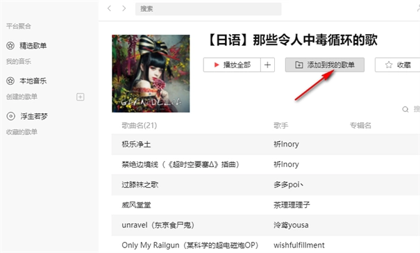 5、第五步,点击“确认”之后,页面中会出现该歌单的详情页面,我们点击歌单页面中的“添加到我的歌单”选项