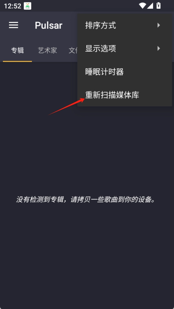 2.若应用里没有显示您的音乐文件,可点击标题栏中的“重新扫描媒体库”按钮,让设备重新扫描音乐文件。